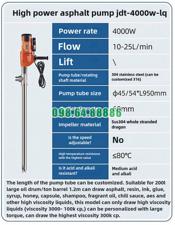 Các loại chất như nhựa đường, keo, resin, mực in, siro hay mật ong thường rất đặc và khó chảy. Nếu chiết rót thủ công hoặc dùng bơm không phù hợp, quá trình này sẽ chậm, dễ gián đoạn và tốn nhiều công sức. Bơm điện hút chất đặc từ thùng phuy JDT-4000W-LQ được thiết kế chuyên cho môi chất có độ nhớt từ 3000–100.000 cps, có thể tùy chỉnh lên tới 300.000 cps, nên hỗ trợ chiết rót hiệu quả hơn rõ rệt.