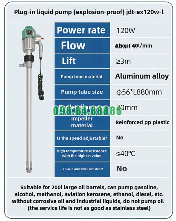 Máy bơm chất lỏng cắm trực tiếp chống cháy nổ JDT-EX120W-L phát huy tốt khả năng chống oxy hóa khi sử dụng với các chất lỏng không có tính ăn mòn mạnh.