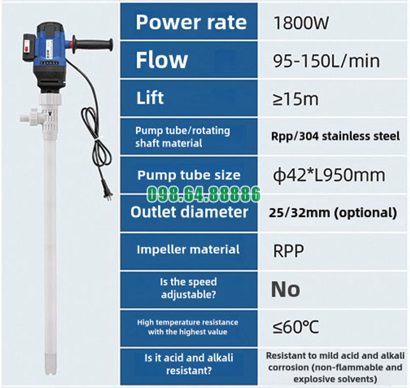 Một trong những ưu điểm vượt trội của Máy bơm chất lỏng điện cắm điện JDT-1800W-RPP là thiết kế gọn gàng và linh hoạt. Máy có ống bơm dài khoảng 950 mm, phù hợp với thùng phuy 200L hoặc các thùng chứa lớn.
