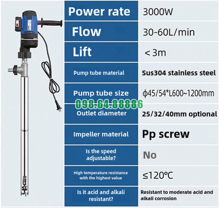 Ống bơm của Máy bơm thùng phuy inox JDT-3000W-LGG120 có chiều dài từ 600 đến 1200 mm, giúp thiết bị dễ dàng tiếp cận đáy thùng phuy 200L hoặc thùng chứa lớn.