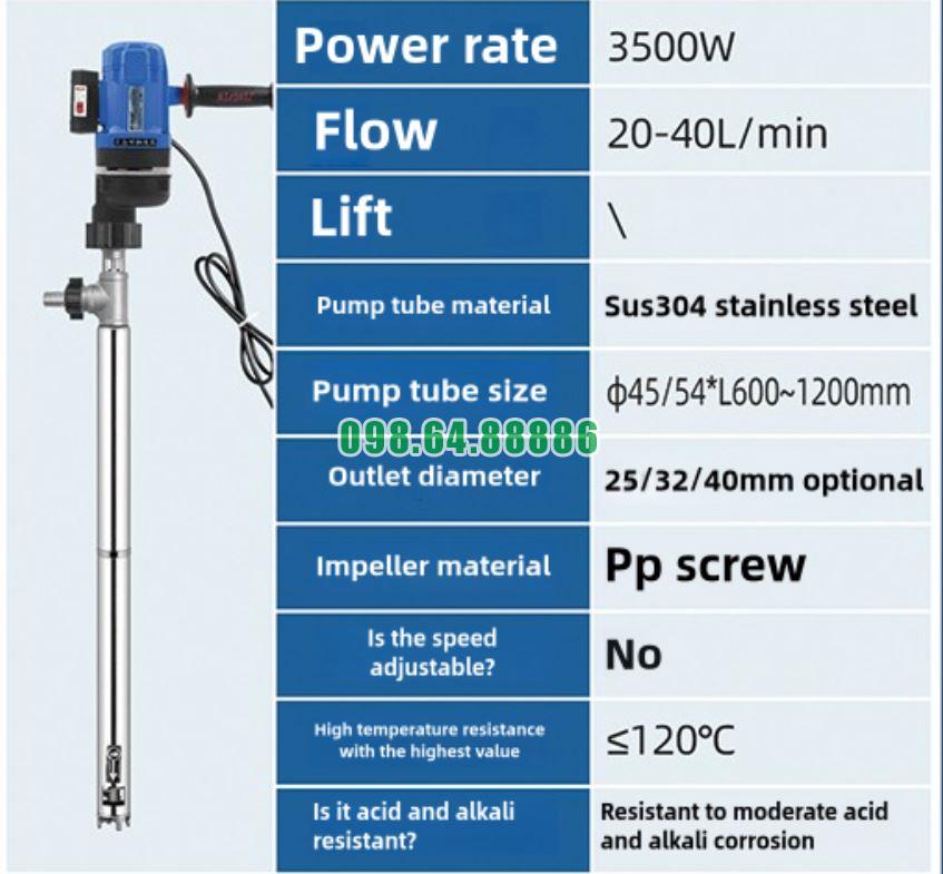 Máy bơm điện cầm tay hút thùng phuy JDT-3500W-LGG120 không chỉ mạnh mẽ mà còn được trang bị kết cấu trục bơm cực kỳ bền bỉ và chống ăn mòn, giúp máy hoạt động ổn định trong nhiều môi trường hóa chất hoặc môi trường có tính ăn mòn cao.