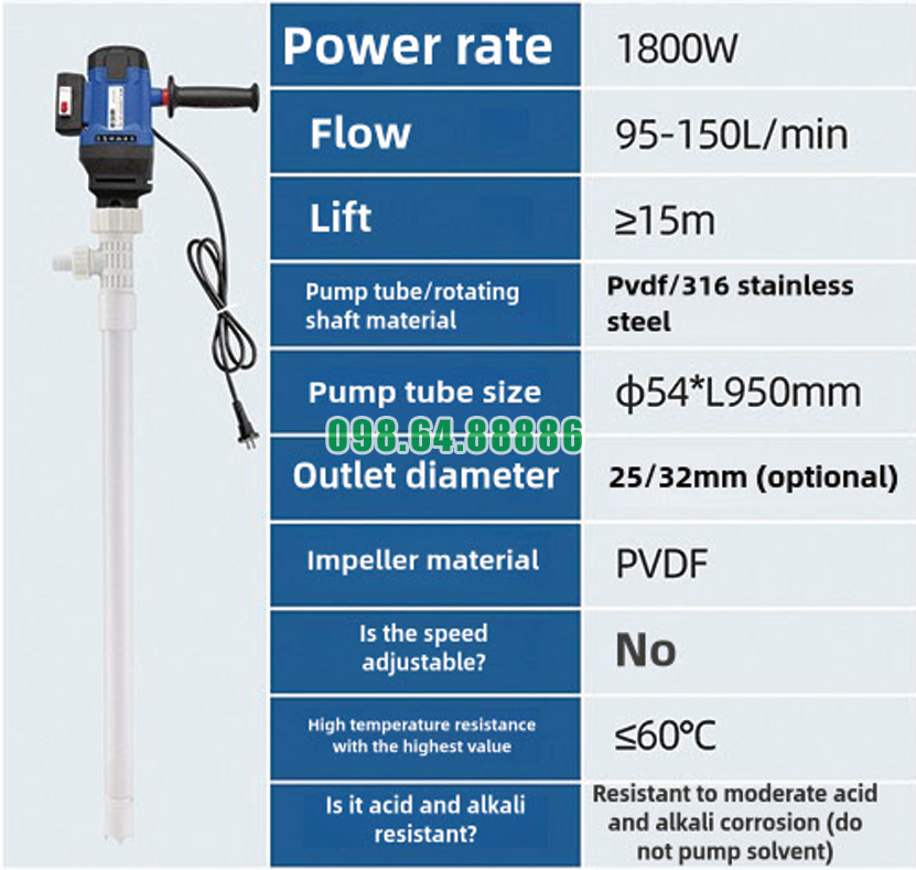 Một yếu tố quan trọng trong thiết kế hiện đại và chắc chắn của Máy bơm điện bơm chất lỏng thùng phuy JDT-1800W-PVDF là chiều dài ống bơm được thiết kế phù hợp với các thùng chứa phổ biến.