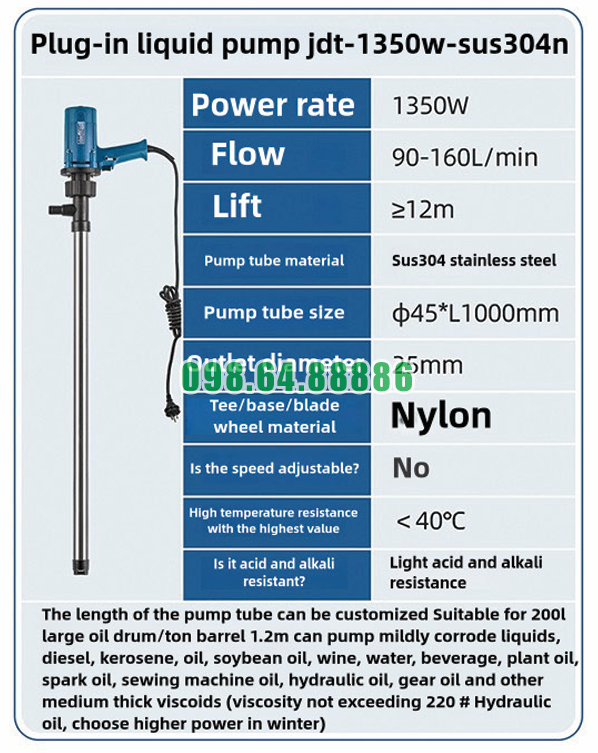 Máy bơm hút chất lỏng cắm điện JDT-1350W-SUS304N