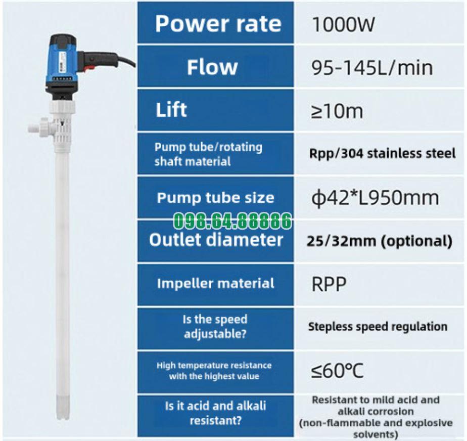 Bơm cắm điện thùng phuy model JDT-1000W-PVDF sở hữu kiểu dáng công nghiệp hiện đại, được thiết kế tối ưu cho môi trường sản xuất chuyên nghiệp, nơi yêu cầu cao về tính thẩm mỹ, an toàn và hiệu quả vận hành.