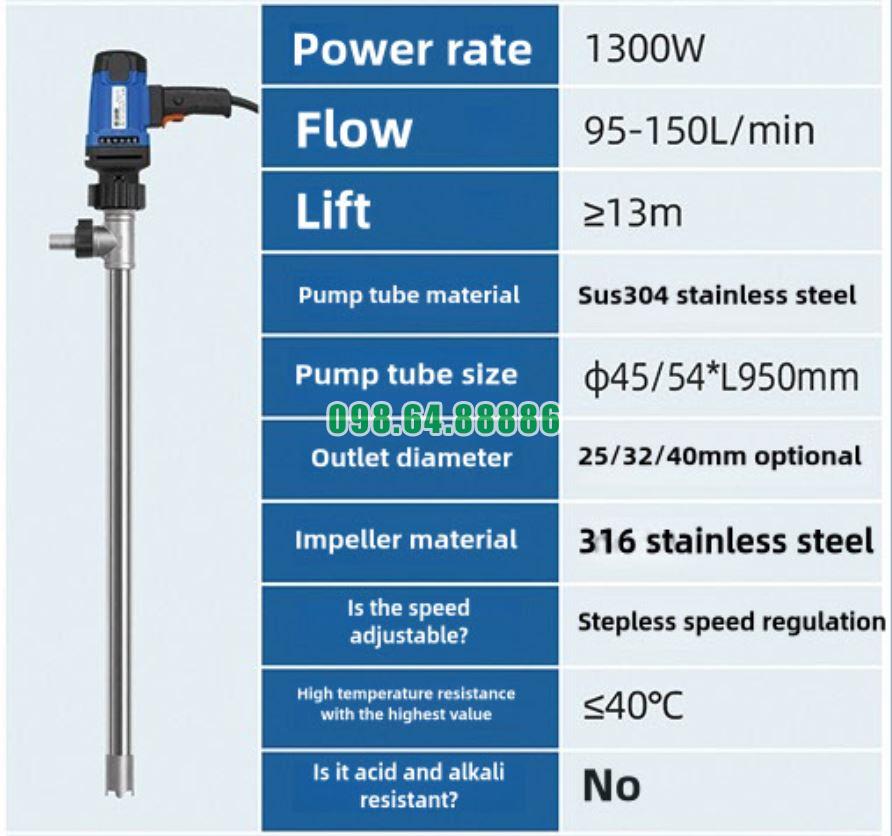 Bơm điện thùng phuy JDT-1300W-304SUS sử dụng nguồn điện để cung cấp năng lượng cho động cơ.