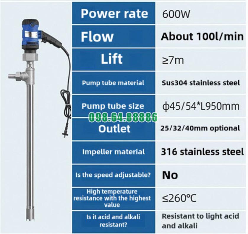 Bơm chìm hút thùng phuy nhiệt độ cao JDT-600W-G260 được tối ưu hóa từ đầu hút đến đầu đẩy nhằm đảm bảo khả năng vận chuyển chất lỏng nóng, dung môi và hóa chất ở nhiệt độ cao lên tới 260°C. Thiết kế này giúp bơm hoạt động ổn định, lưu lượng mạnh và phù hợp với nhiều yêu cầu trong sản xuất công nghiệp.