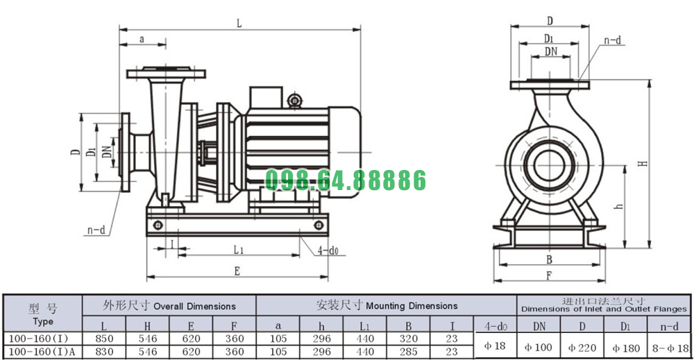 Bản vẽ cấu tạo và kích thước bơm nước nằm ngang SLW100- ISW100-160-I đẩy cao từ 27m- 36m