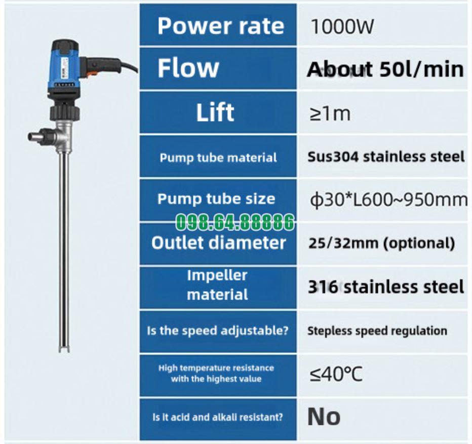 Bơm thùng phuy inox chịu nhiệt JDT-1300W-G260 được sử dụng trong các ứng dụng kỹ thuật như bơm dầu thực phẩm nóng, siro hoặc dung dịch xử lý nhiệt, nơi yêu cầu vật liệu inox an toàn và chịu nhiệt.