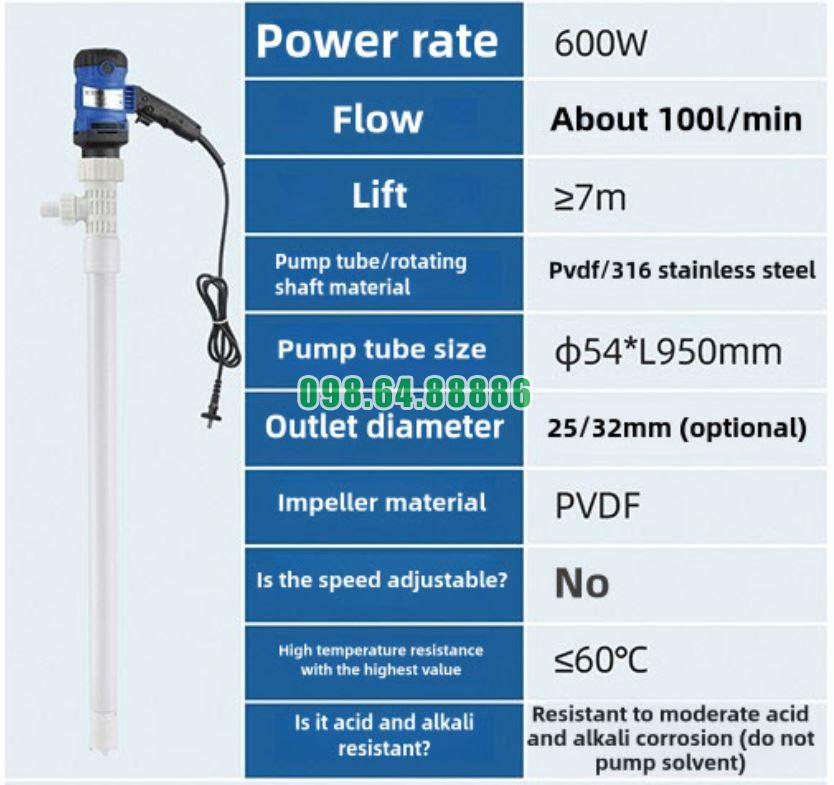 Bơm thùng phuy thân nhựa PVDF JDT-600W