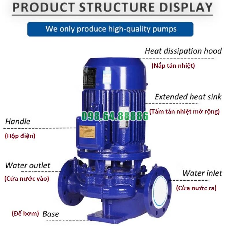 Bơm được thiết kế theo trục thẳng đứng, nghĩa là động cơ được đặt thẳng đứng phía trên thân bơm. Cấu trúc này: